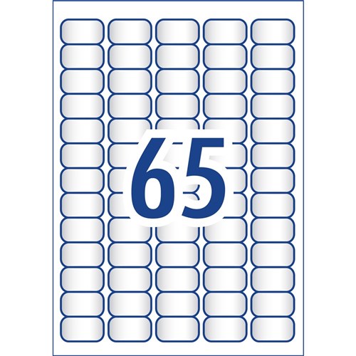 • Size: 38.1x21.2mm 1625 labels, 25 sheets. 65 labels per sheet (65UP).