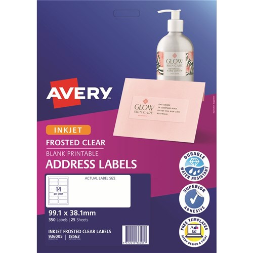 Avery Frosted Clear Inkjet Address Labels J8563 99.1x38.1mm 14UP 350 Labels