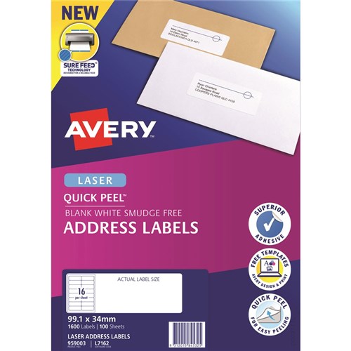 Avery Quick Peel Address Laser White L7162 99.1x34.2mm 16UP 1600 Labels 100 Sheets