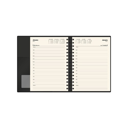 • Pen loop, lay flat opening, ribbon marker, vertical week to view layout.