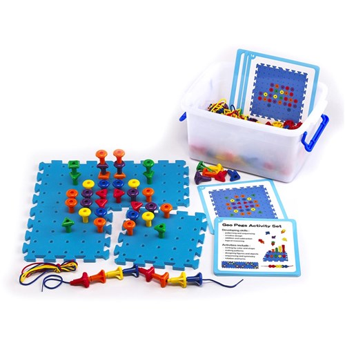 • Set includes 4 EVA foam boards that can be joined together, 144 pegs in 6 colors, 12 laces and 12 double sided activity cards in a sturdy plastic container.