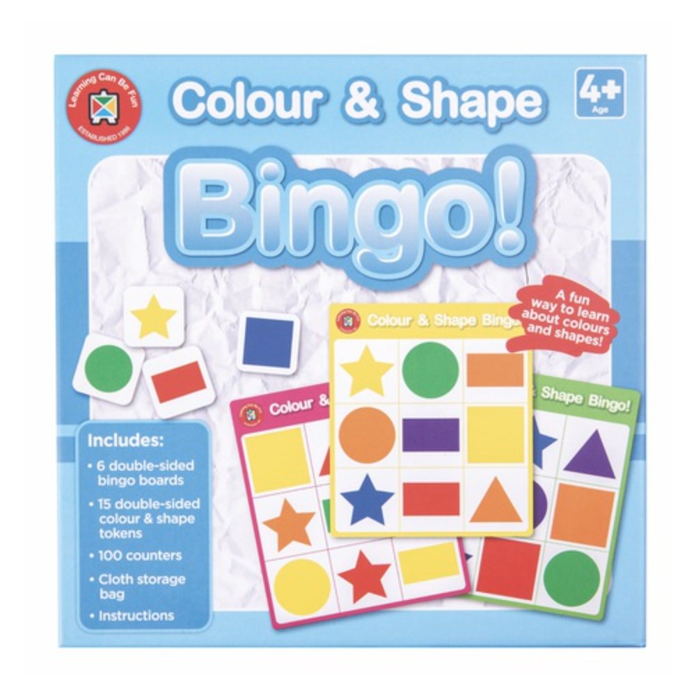 • Includes: 6 double-sided bingo boards, 15 double-sided colour and shape tokens, 100 counters, cloth storage bag and instructions.
