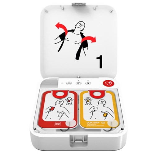 • Layered design with easy to follow bold graphics. Both trained and untrained AED users clearly know how to begin.