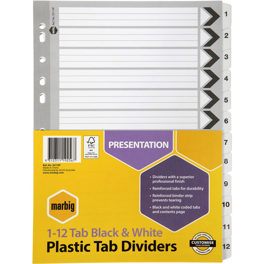 Marbig Plastic Indices & Dividers A4 Reinforced 1-12 Tab Black