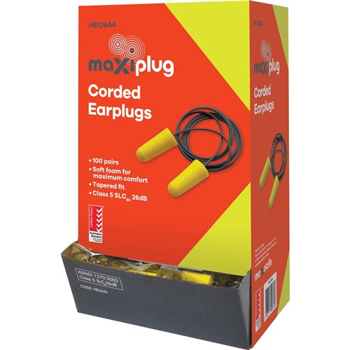 Maxisafe MaxiPlug Ear Plugs Disposable Corded 26dB Yellow And Black Pack Of 100 Pairs