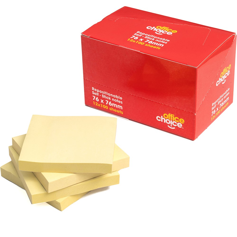 Office Choice Repositionable Sticky Notes 100 Sheets Yellow 76 x 76mm Pack of 12