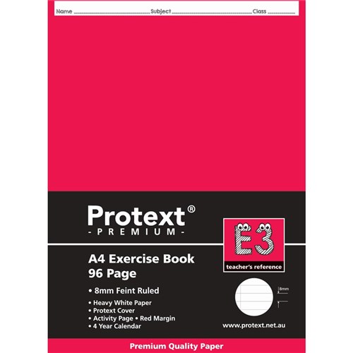 • Protext Premium Exercise Books combine Premium 70gsm Bond paper, crisp rulings and a clear polyproylene cover - no need to cover your books! Each book features a unique teachers reference, ruling reference, activity page, maths tables and conversion charts