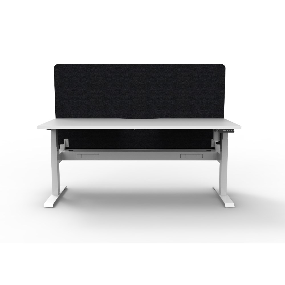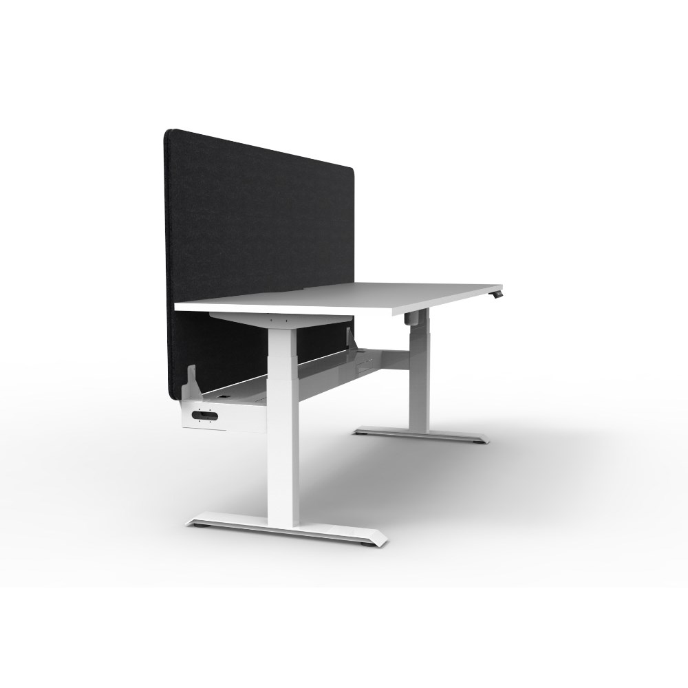 • Electric height adjustable single sided workstation with Natural White top and White Satin frame, Black Eco screen and cable tray.