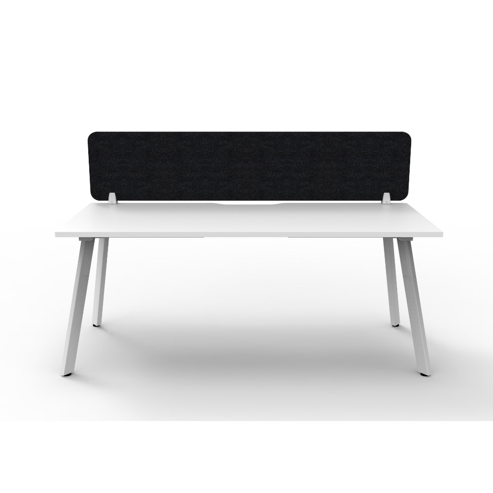 • Natural White worksurface with rigid edging and 410mmW x 50mmD scallop cable access. White Satin powder coat frame. Eco screen.
