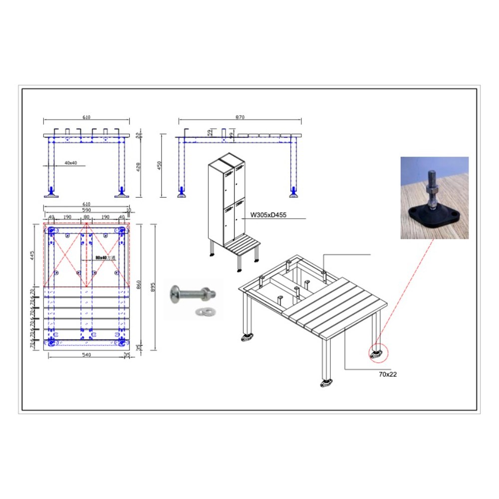 • Allows the user to sit in front of the locker to change whilst allowing for cleaning underneath the unit.