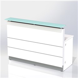 • Modern simple designed reception counter finished in Beech Melamine front and side panels with Gloss White feature panel and Matt White Melamine desktop.