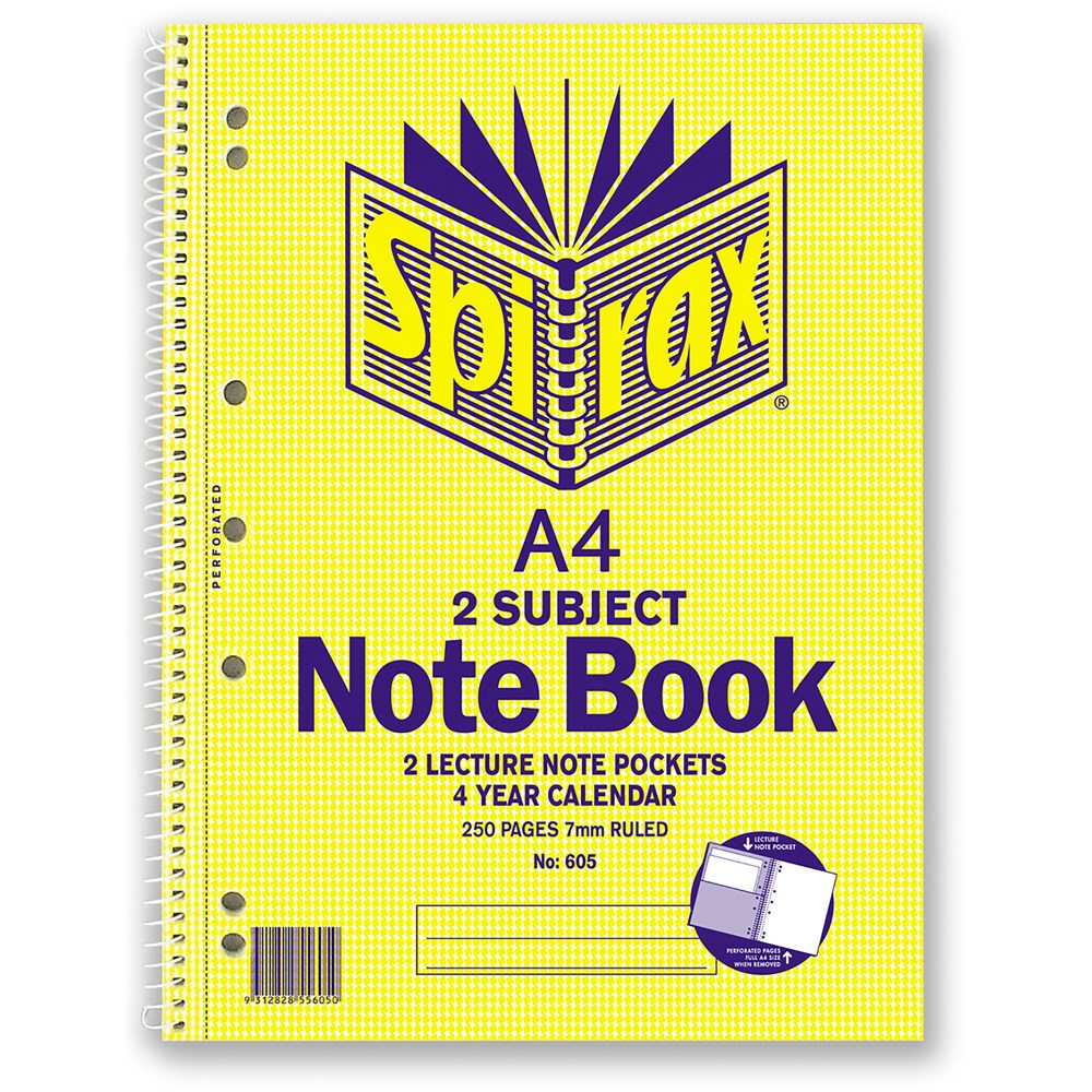 Spirax 605 2 Subject Notebook Perforated/Note Pockets A4 Ruled 250 Page Side Opening