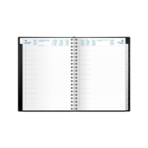 • Double wire binding. Lay flat opening. Ribbon marker. Tabs. Translucent pocket.